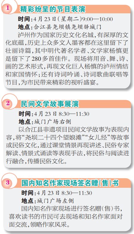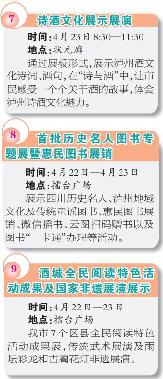 明日,2019四川省暨泸州市全民阅读活动启动仪式将在合江县尧坝镇举行,以“精品奉献人民阅读引领风尚”为主题。![]() 启动仪式上将进行书法作品赠送、图书捐赠,以及四川历史名人丛书(第一批)首发式。 我们来看看 今年全名阅读活动有啥亮点 ↓↓↓ ![]() 9大亮点活动 ![]() ![]() ![]() ![]() > > > >- >END - r> 消息回顾: ●今晚泸州天气内部促销会:雷雨+阵风+冰雹 ●四川省五一劳动奖候选名单出炉丨来看泸州有哪些单位和个人入选 ●增速8.5%丨2019年一季度泸州市GDP436.2亿元 ●四川省“金熊猫”奖名单公布丨泸州这些单位和个人上榜! 责编丨杨茜 谢蕤 编辑丨陈相竹 ![]() ![]() — 欢迎分享到朋友圈— r> 本文系“泸州发布”官方稿件,r> 未经授权,不得转载 |