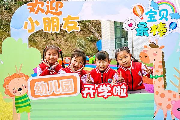 (图为四川省泸县福集镇中心幼儿园举行开学仪式,在校门口打卡合影。曾茂妮 摄)