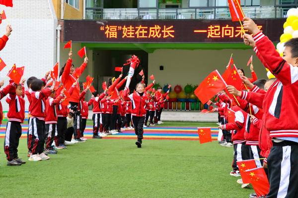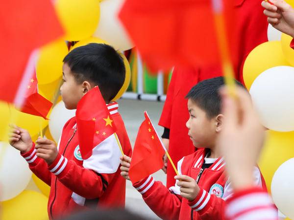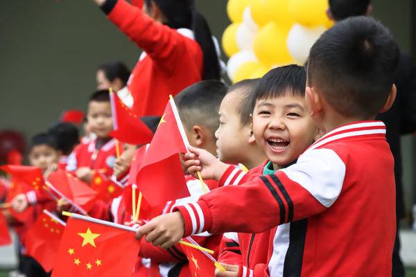 (图为四川省泸县福集镇中心幼儿园举行升旗仪式,师生齐唱国歌、挥舞国旗。曾茂妮 摄)