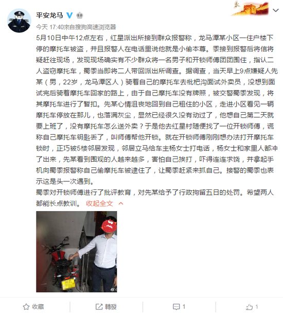![]() 群众报警抓贼的事情常有,但小偷自己报警找警察就稀奇了。5月10日,泸州市龙马潭区红星派出所民警就遇到了这样一个奇葩小偷,自己主动打电话报警。这到底演的是哪一出? 5月10日中午12点左右,红星派出所接到群众报警称,龙马潭某小区一住户楼下停的摩托车被盗,并且报警人在电话里说他就是小偷本人。 满是怀疑的民警不明就里,但还是迅即赶到现场。事发小区楼下,确实有不少群众将一名男子团团围住,同时被围在人群中间的还有一名开锁师傅。现场群众指认,正是被围困的两人盗窃摩托车,民警当即将二人带回派出所调查。 据调查,当天早上9点,嫌疑人先某(男,22岁,龙马潭区人)骑着自己的摩托车去面试外卖员,由于自己摩托车没有牌照,面试完后骑着摩托车回家的路上,被交警发现,将其摩托车进行了暂扣。 ![]() 先某心情沮丧地回到自己租住的小区,走进小区看见一辆摩托车停放在角落,且落满灰尘,显然已经很久没有动过了。他想自己第二天就要上班了,没有摩托车怎么送外卖?于是他去红星村随便找了一位开锁师傅,谎称自己摩托车钥匙丢了,叫师傅帮他开锁。 就在开锁师傅刚刚想办法打开摩托车锁时,正巧被5楼邻居发现,邻居立马给车主杨女士打电话,杨女士和家里人冲下楼来……先某看到围观的人越来越多,害怕自己挨打,吓得连连求饶,并拿起手机报警称自己偷摩托车被逮住了,让警察赶紧来抓自己。 小偷自己报警求带走,接警的民警也表示这是头一次遇到。最终,派出所民警对开锁师傅进行了批评教育,对先某给予了行政拘留五日的处罚。 屈桢 成都商报客户端记者 杨灵 |