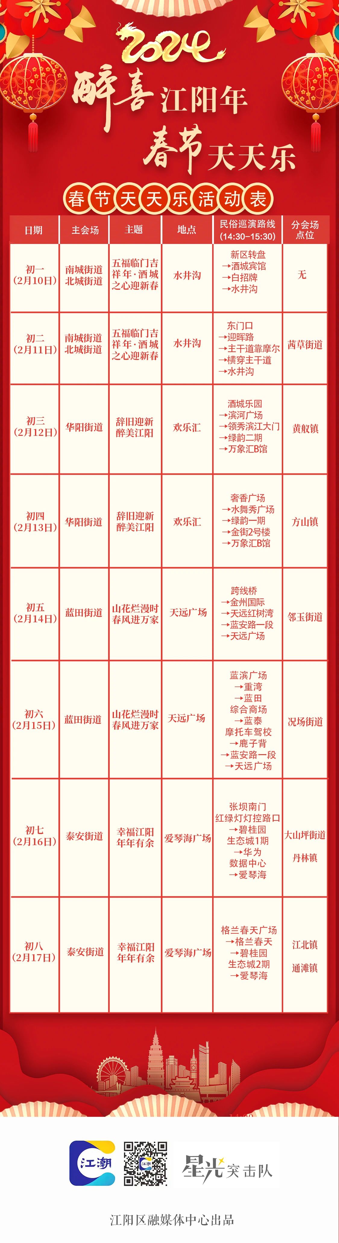 春节即将到来 你是否已经按捺不住激动的心情 打算好好地玩一玩? 在江阳精彩过年 新春活动天天乐 故地重游解乡愁 新晋景点添欣喜 大家翘首企盼的2024年“醉喜江阳年 春节天天乐”活动耍法多多、乐趣多多。初一至初八(2月10日至2月17日),在水井沟、欢乐汇、天远广场、爱琴海广场各开展为期2天的活动;正月十五(2月24日)在分水岭镇开展元宵节活动;各街镇也会在春节期间组织开展活动。