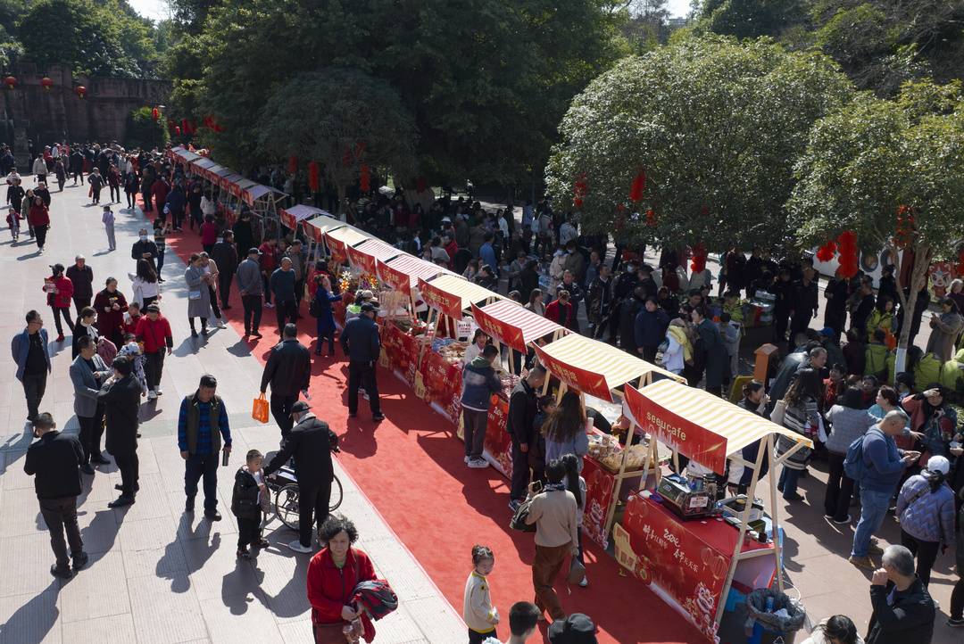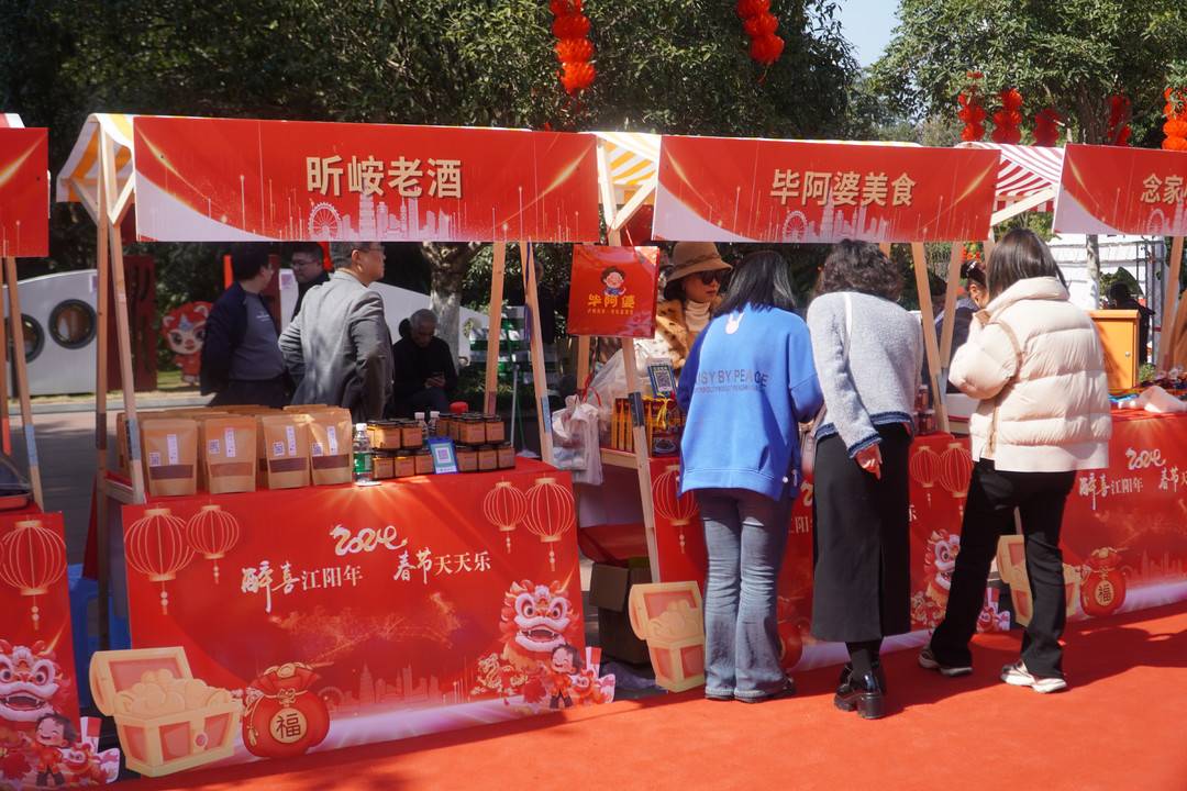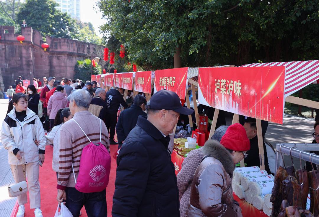 还有一个接一个的展销摊,上面摆满了糖葫芦、爆米花、米花糖、香肠腊肉等各种特色风味小吃,令人垂涎欲滴,引得一众市民驻足,品尝、挑选、购买,人们迫不及待将新春的年味带回家。
