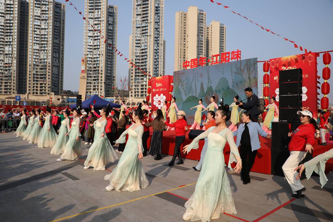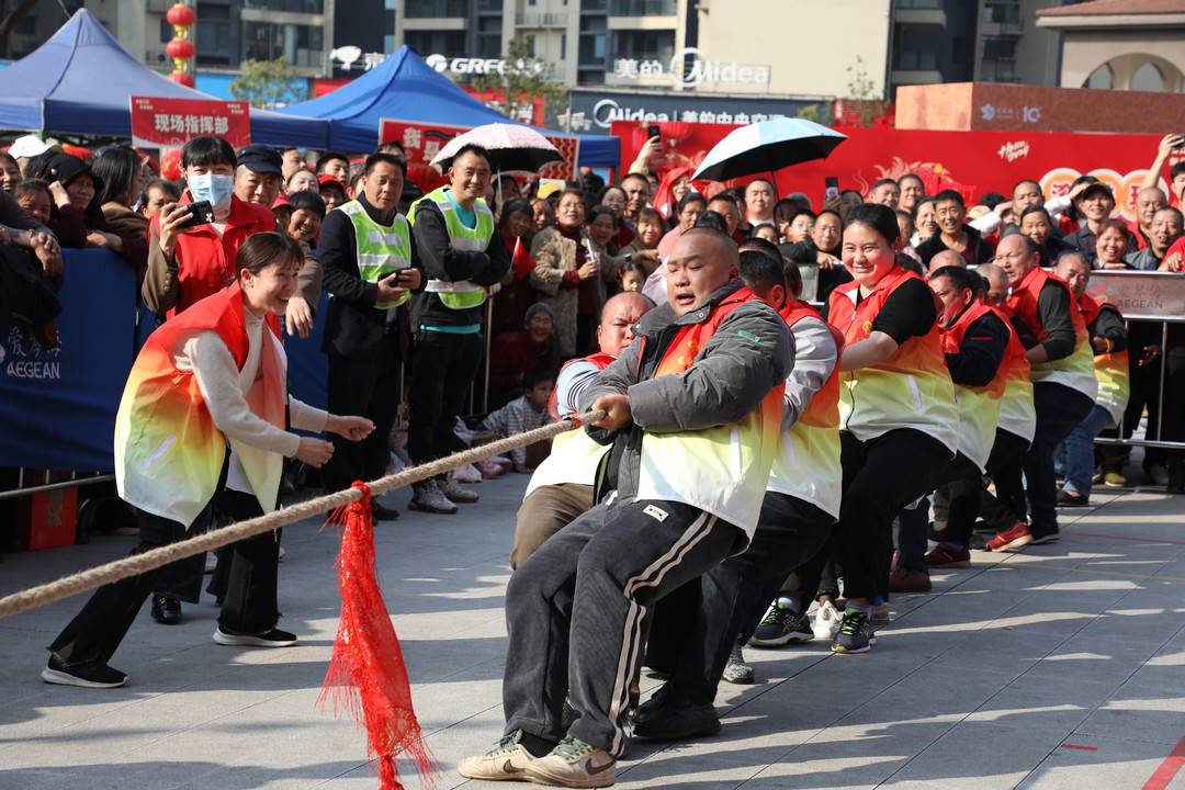 快闪表演(谢婉玲 摄) 新春市集上,各式各样、大大小小的摊位遍布,好吃的、好看的、好玩的应有尽有,人们可以在这里“一网打尽”。 还有猪八戒背媳妇、拔河、龙年接福挑战赛、旱地龙舟赛四项精彩赛事火热继续,持续炸场。