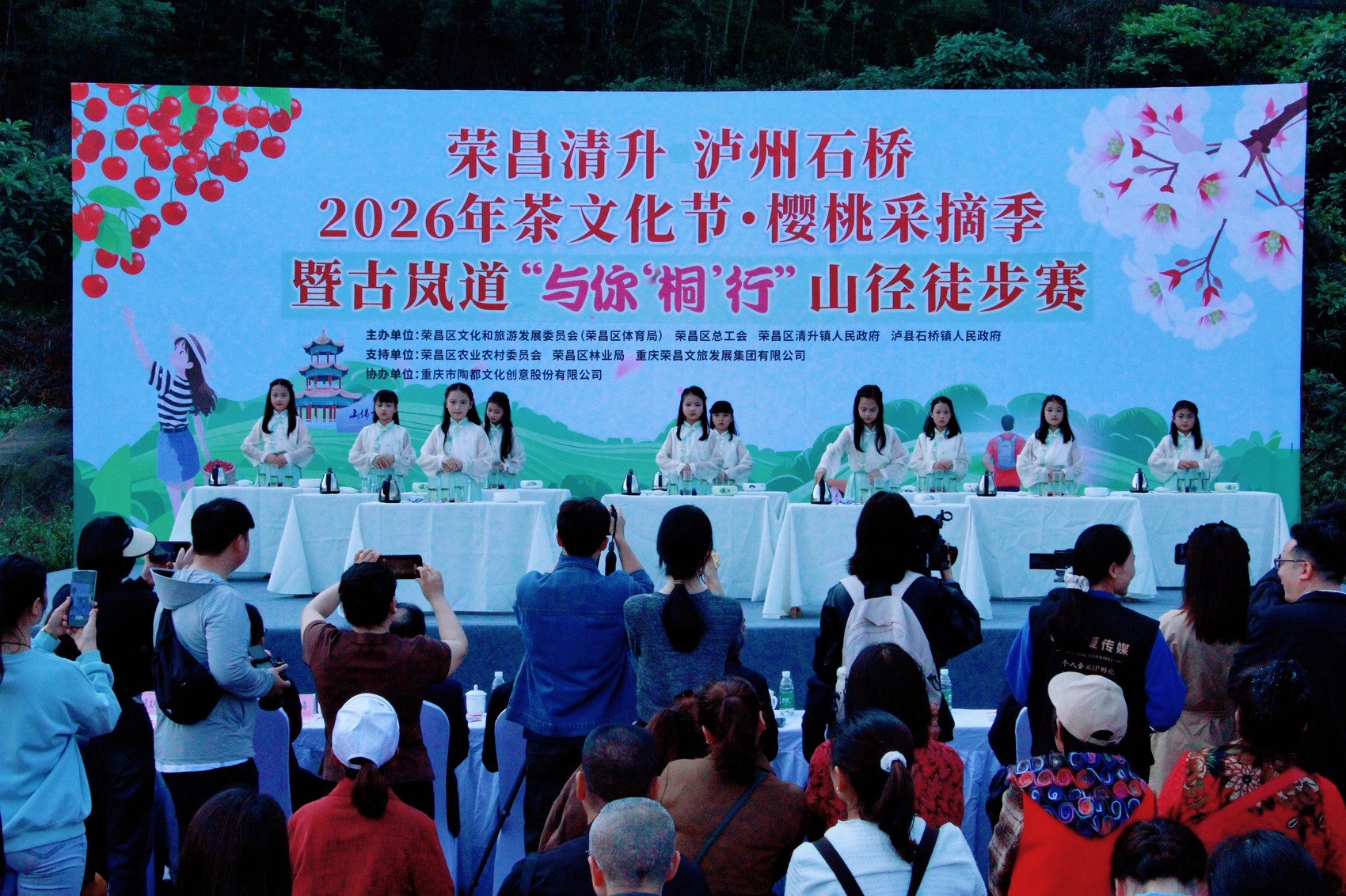 | 4月9日,四川泸县石桥镇与重庆荣昌区清升镇再次携手,在古佛山麓共同举办“2026年茶文化节・樱桃采摘季暨古·岚·道‘与你‘桐’行’山径徒步赛”,吸引了400名徒步爱好者、30名采茶选手及无数游客共赴这场山水之约。