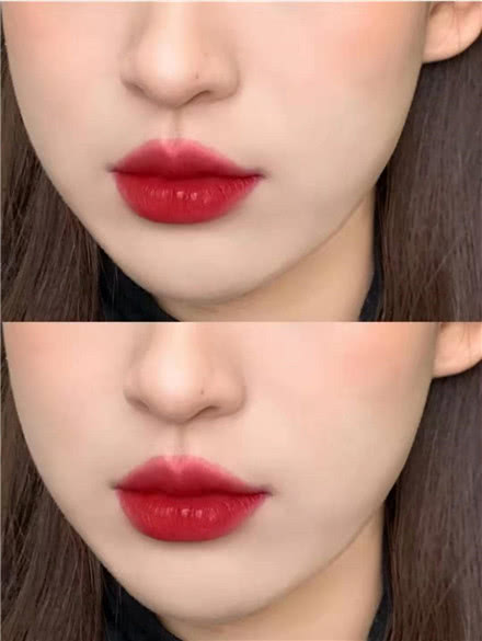 选一支正红色的哑光口红,画出饱满的唇形,人中位置画的超出一些,这样厚厚的嘴唇很性感~这样妆容就完成啦!