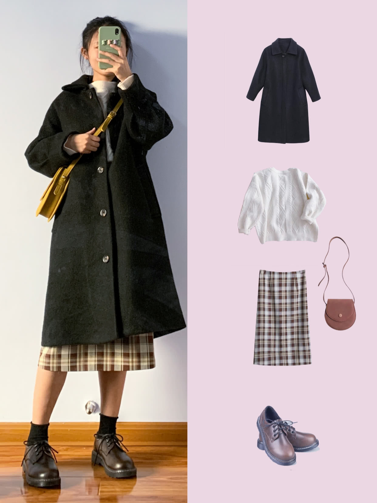 经典的黑白配是最耐看的颜色,所以当你在纠结黑色大衣的内搭该选什么颜色的时候,可以考虑一下白色单品。用黑色大衣穿出百变风格,格纹的半身裙,包臀的版型,很显身材。如果觉得黑色大衣太过暗沉,那在选择包包的时候,get一个黄色的斜跨包,增添造型的亮点又显活力感。