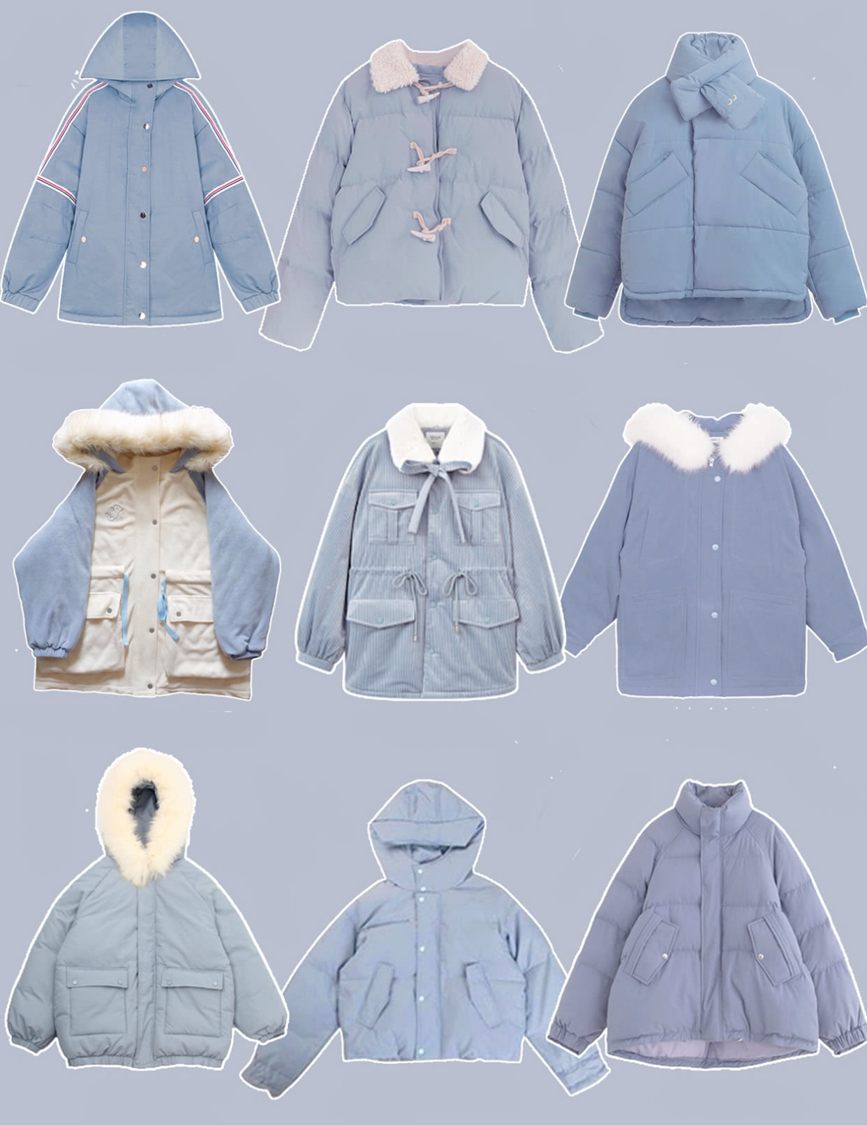 冬季白雪皑皑,和蓝色短款棉服很配。就像冬天你手捧一杯奶茶,多么暖心的一幕,让你勇敢无惧。当然啦,黄色与白色是最为匹配,所以衣领就考虑用白色为主,这样子就打造出最为吸睛的蓝白配CP。