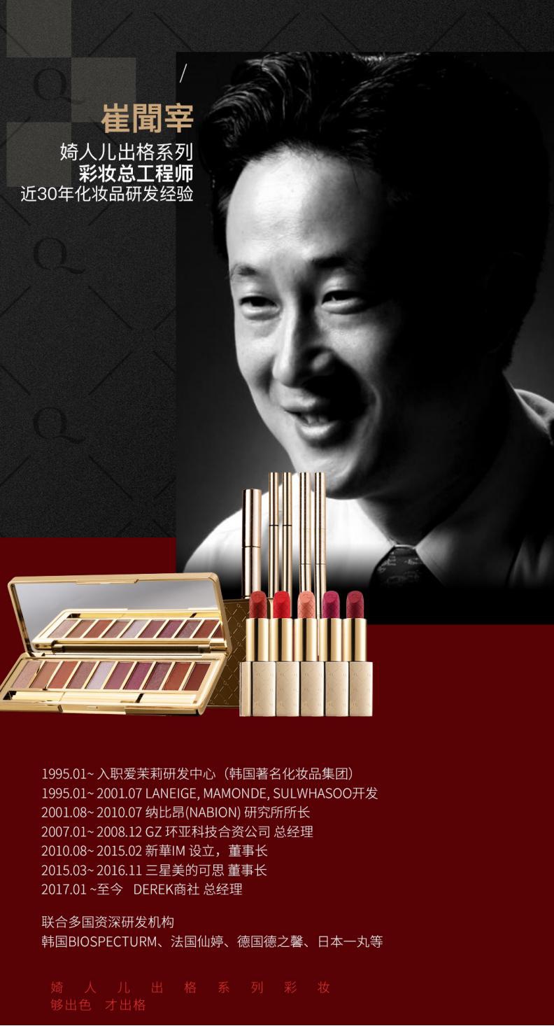 除此之外,还邀请了全球著名研发工程师崔聞宰为婍人儿出格系列彩妆提供产品研发支持,让出格系列彩妆更加出色!
