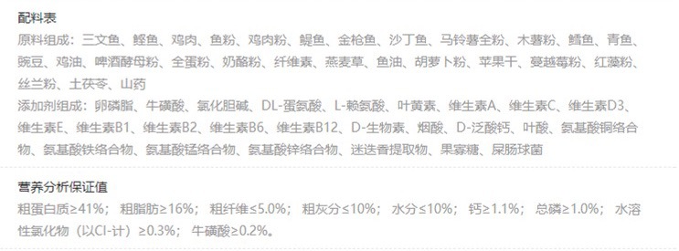 这款猫粮也是近两年很多铲屎官说平价质量口碑较好的猫粮,但是我作为业内人员不是很喜欢它的配方。它的蛋白质主要来源于鸡肉、鱼肉和谷物,来自谷物倒是不要紧,但是它的谷物选的是容易致敏的大米,所以肠胃敏感的猫咪就不要选择这一款了。不过它添加的卵磷脂和牛磺酸倒是比较良心了。