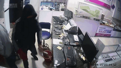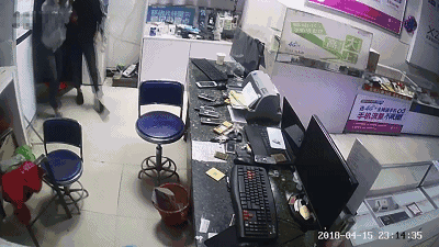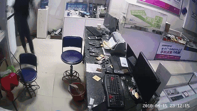 民警通过营业厅监控视频发现:4月15日23时12分,“BONG!”的一声,一名黑衣男子出现在视频内,紧接着,另一名白衣男子也出现了,两人用帽子蒙着头,在吧台的抽屉内翻找东西。